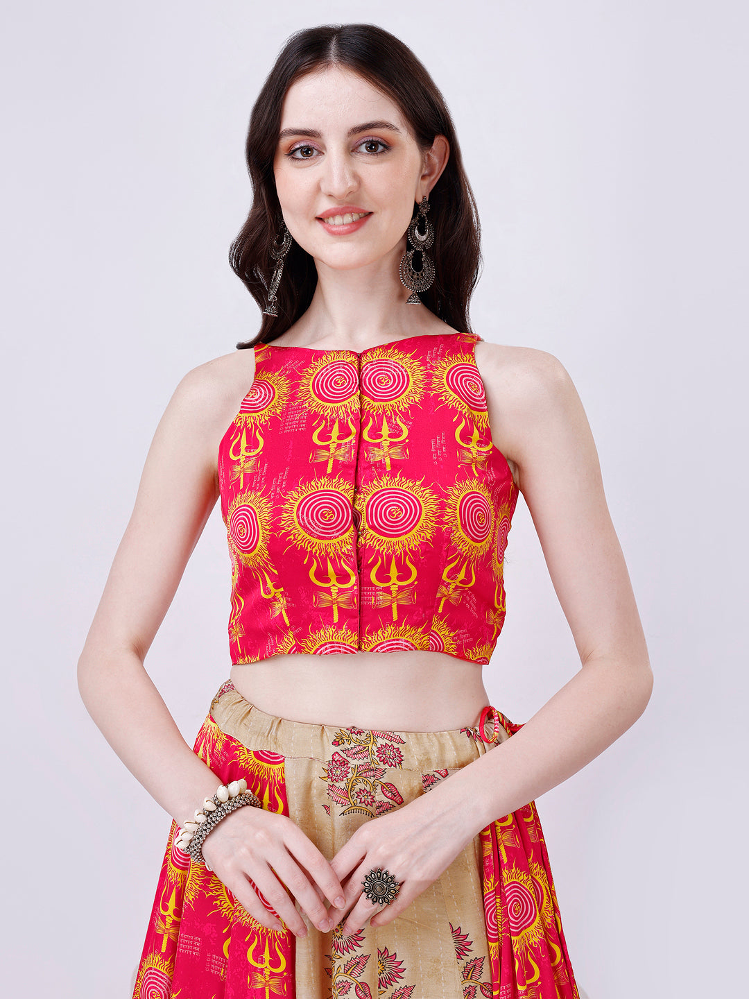 Pink Choli: Made of luxurious hammered satin with a Lord Shiva Trishul and Om print.