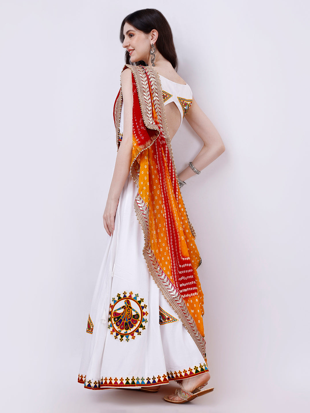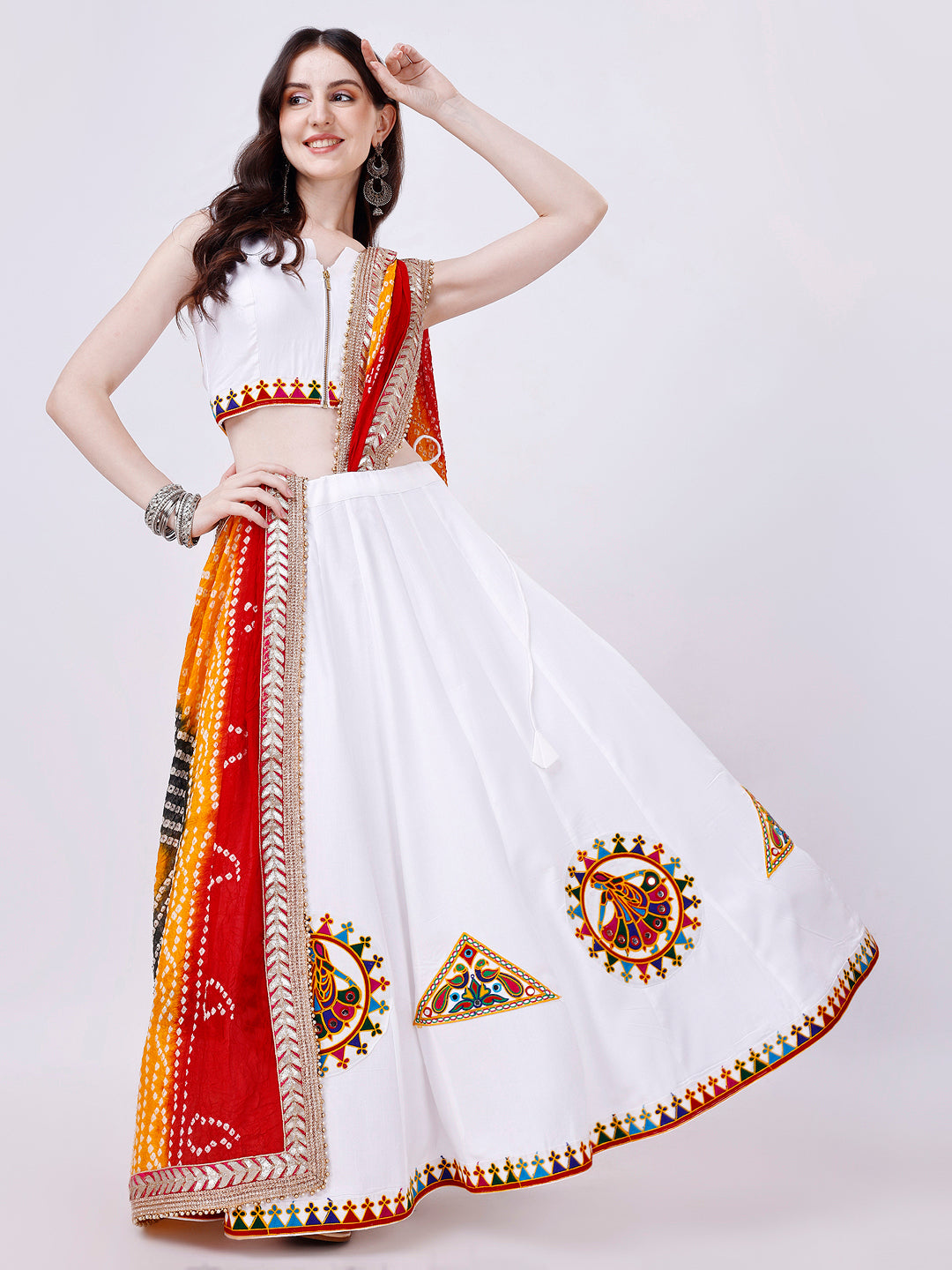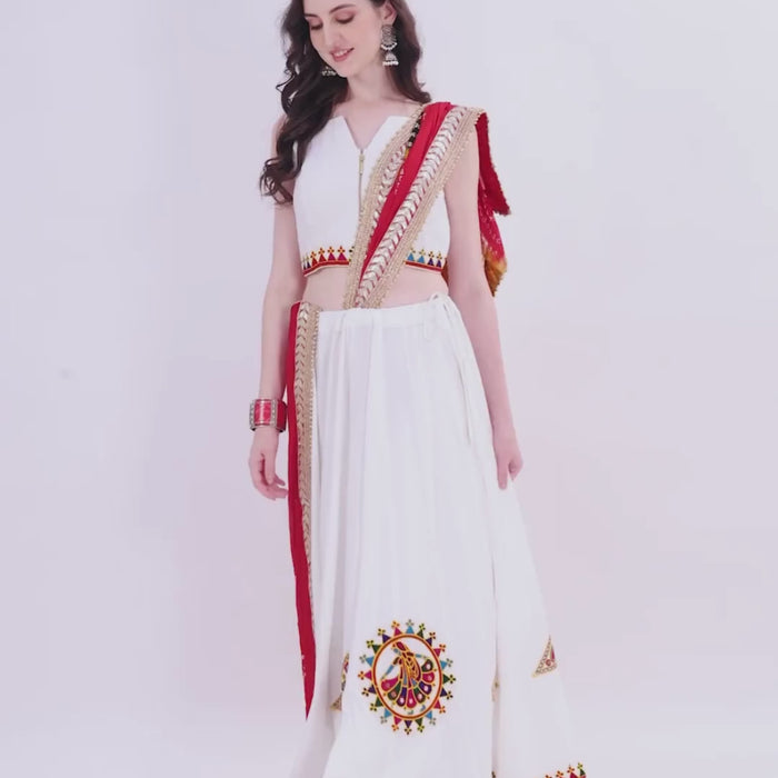 To perfect your look, we've included a vibrant dupatta that adds the ideal finishing touch to your attire. Whether you're dancing the night away or partaking in Navratri festivities, our White Chaniya Choli radiates grace and style.
