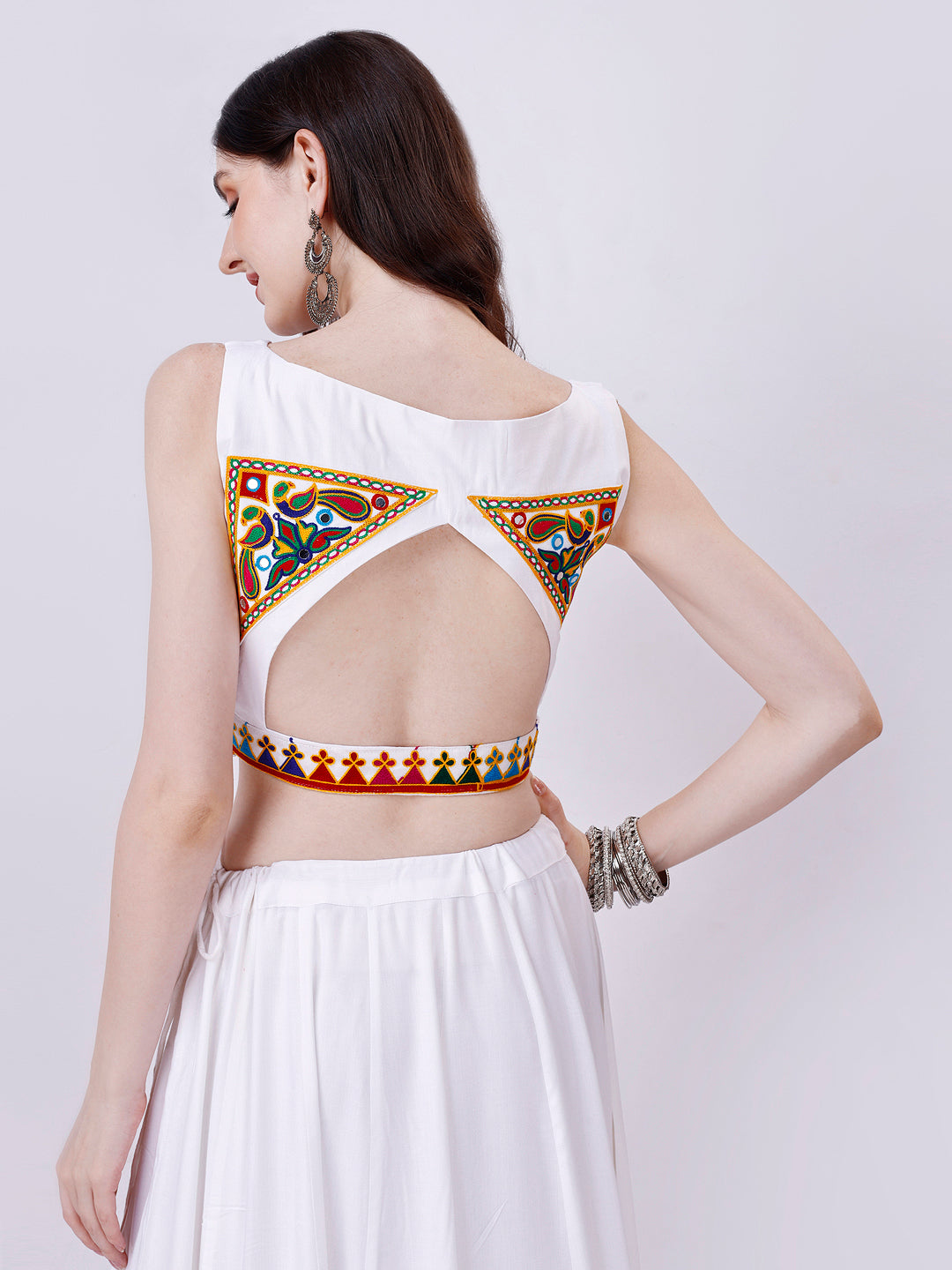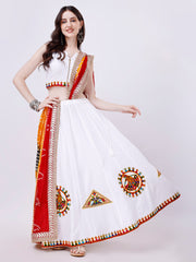 Celebrate the vibrant spirit of Navratri in elegance with our stunning White Chaniya Choli ensemble, thoughtfully crafted for this festive season. Made from luxurious rayon cotton fabric, this sleeveless Choli and Chaniya combine comfort with style seamlessly.