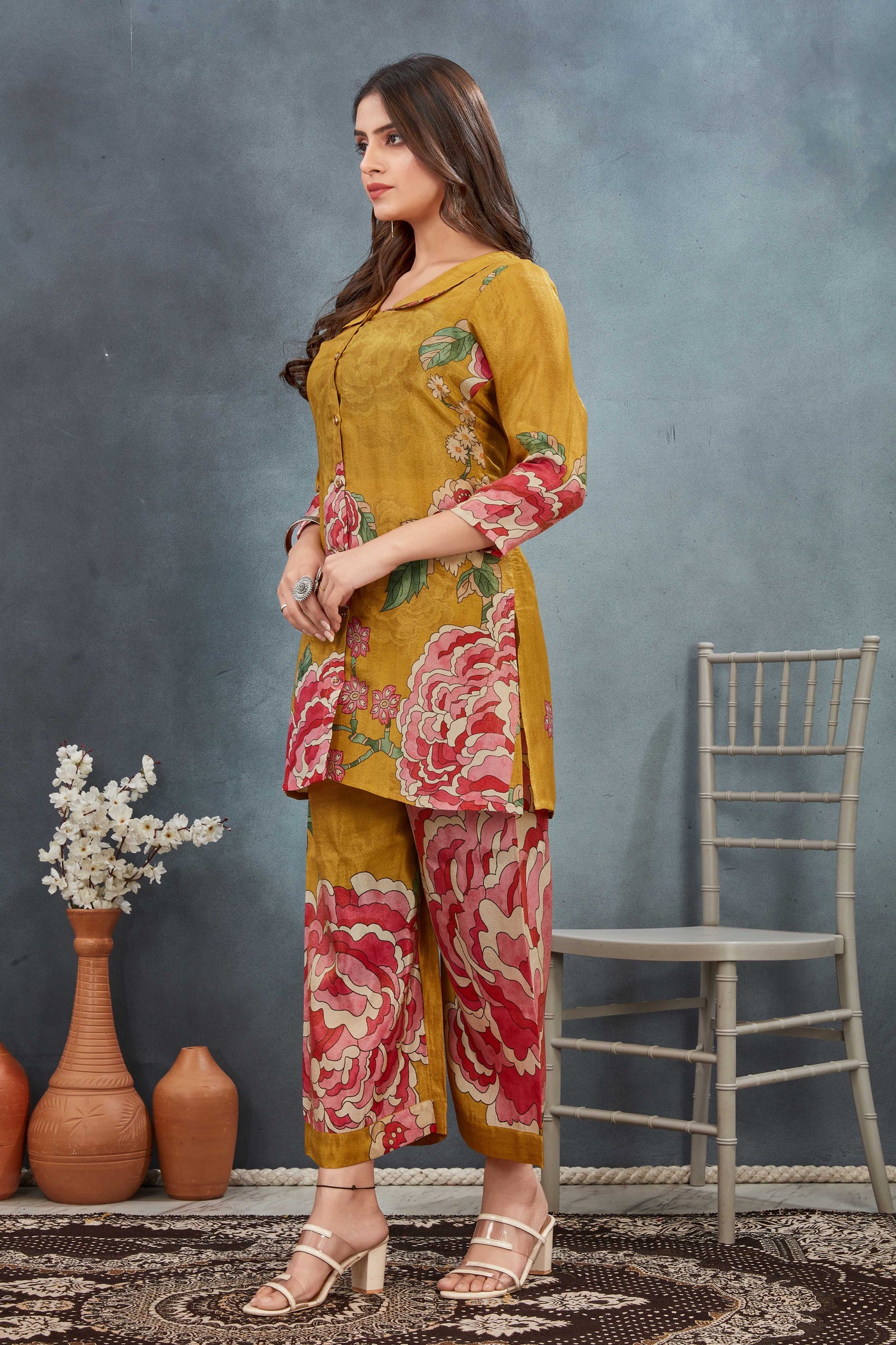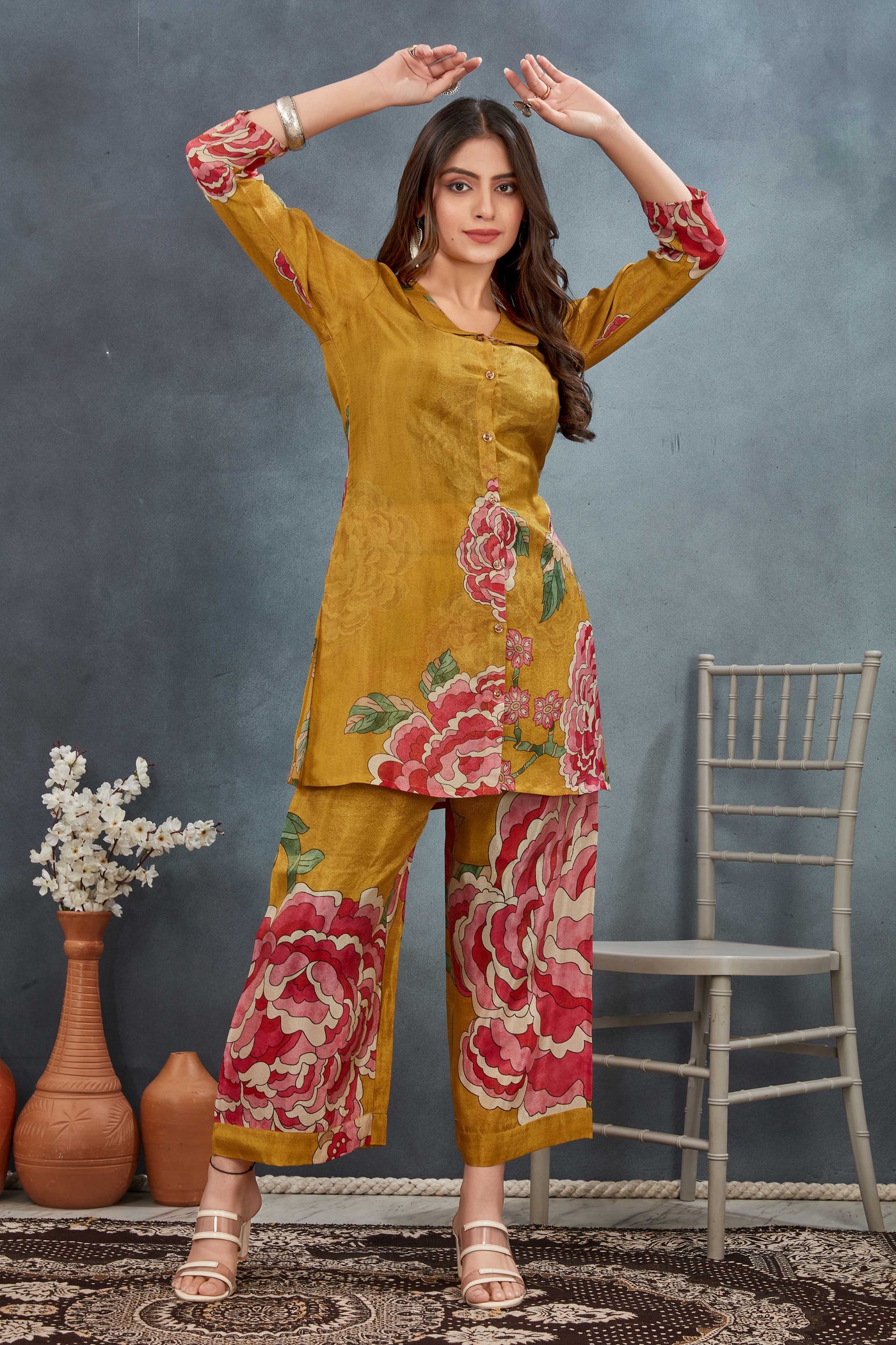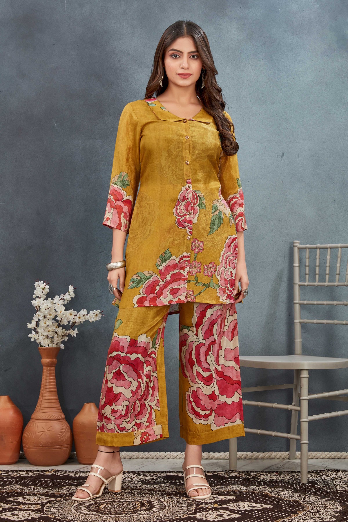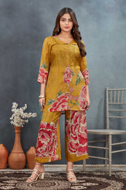 Make a statement with this stunning 2-piece co-ord set! Mustard yellow top pairs beautifully with the floral-print pant, crafted from pure viscose chinnon chiffon, making it perfect for parties, and festive celebrations. A true blend of elegance and charm!
