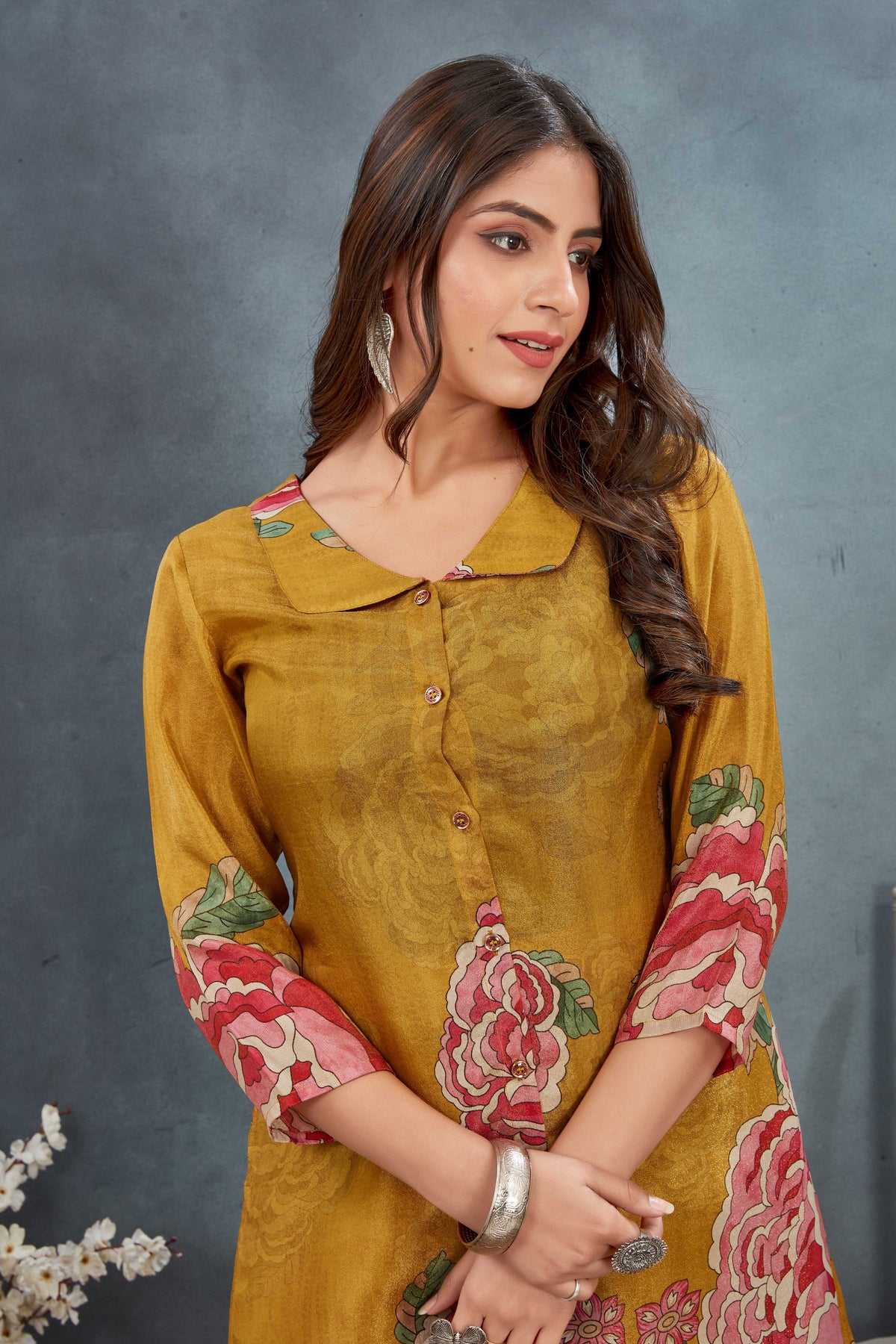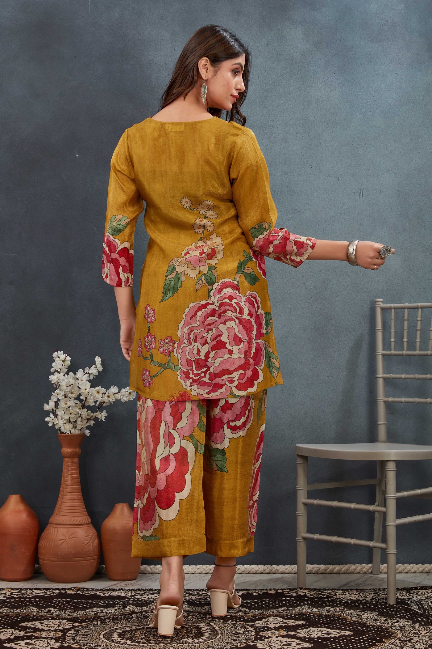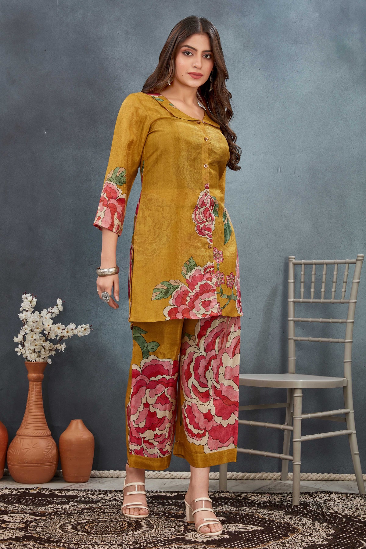Make a statement with this stunning 2-piece co-ord set! Mustard yellow top pairs beautifully with the floral-print pant, crafted from pure viscose chinnon chiffon, making it perfect for parties, and festive celebrations. A true blend of elegance and charm!