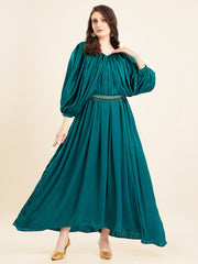 Exquisite Green Hammered Satin Gown with Hand-Embroidered Belt: Luxurious, versatile, and captivating. Flattering green hue, high-quality fabric, and intricate craftsmanship. Perfect for all occasions, exuding confidence and grace. Meticulously designed with attention to detail. Easy maintenance.