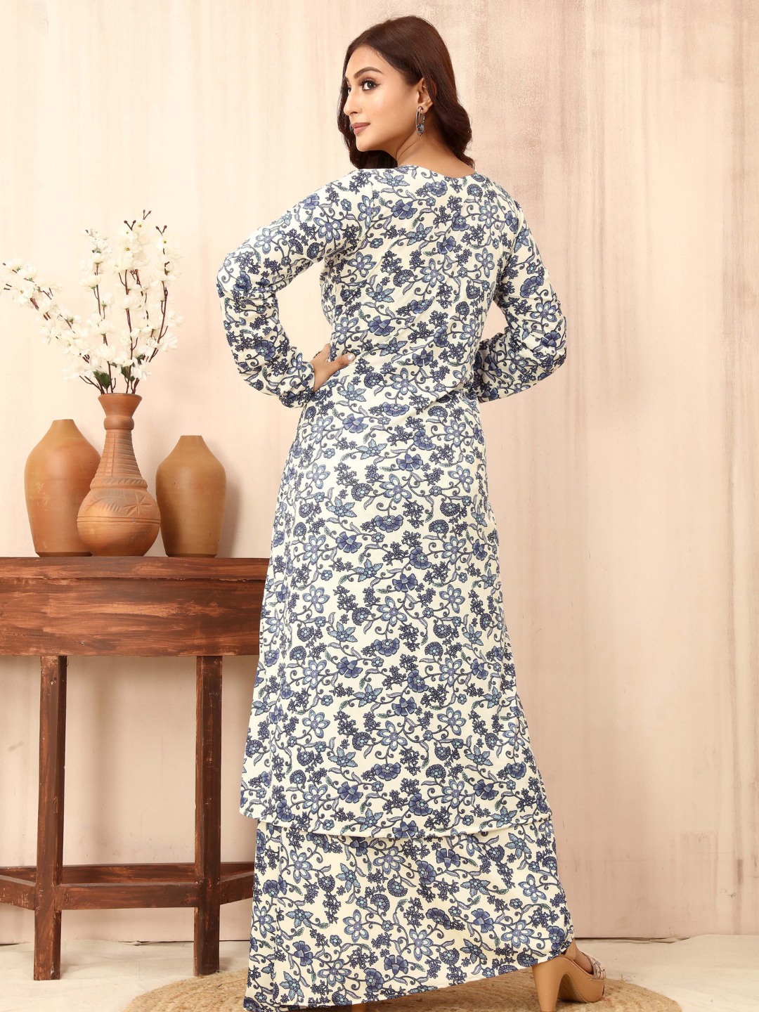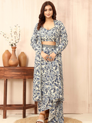 Introducing our exquisite 3-piece White floral print co-ord set, a captivating choice for your festive wardrobe. Crafted from luxurious lycra stretchable fabric, this ensemble boasts a sleeveless top, a flowing drape bottom, and a knee-length, full-sleeved jacket. Adorned with a charming floral print and delicate lace accents on the neckline and waistline, it's an ideal choice for weddings, parties, and special events. Elevate your style and make a statement with this alluring co-ord set, perfect for any celebratory occasion.