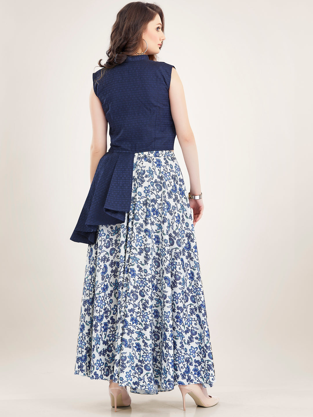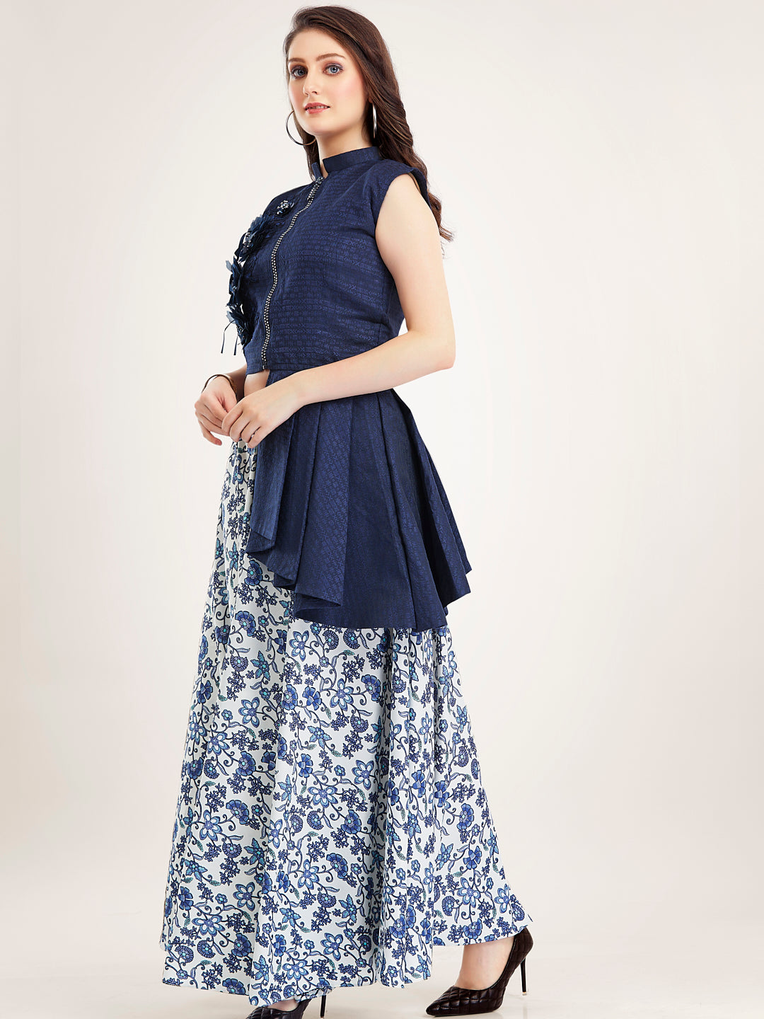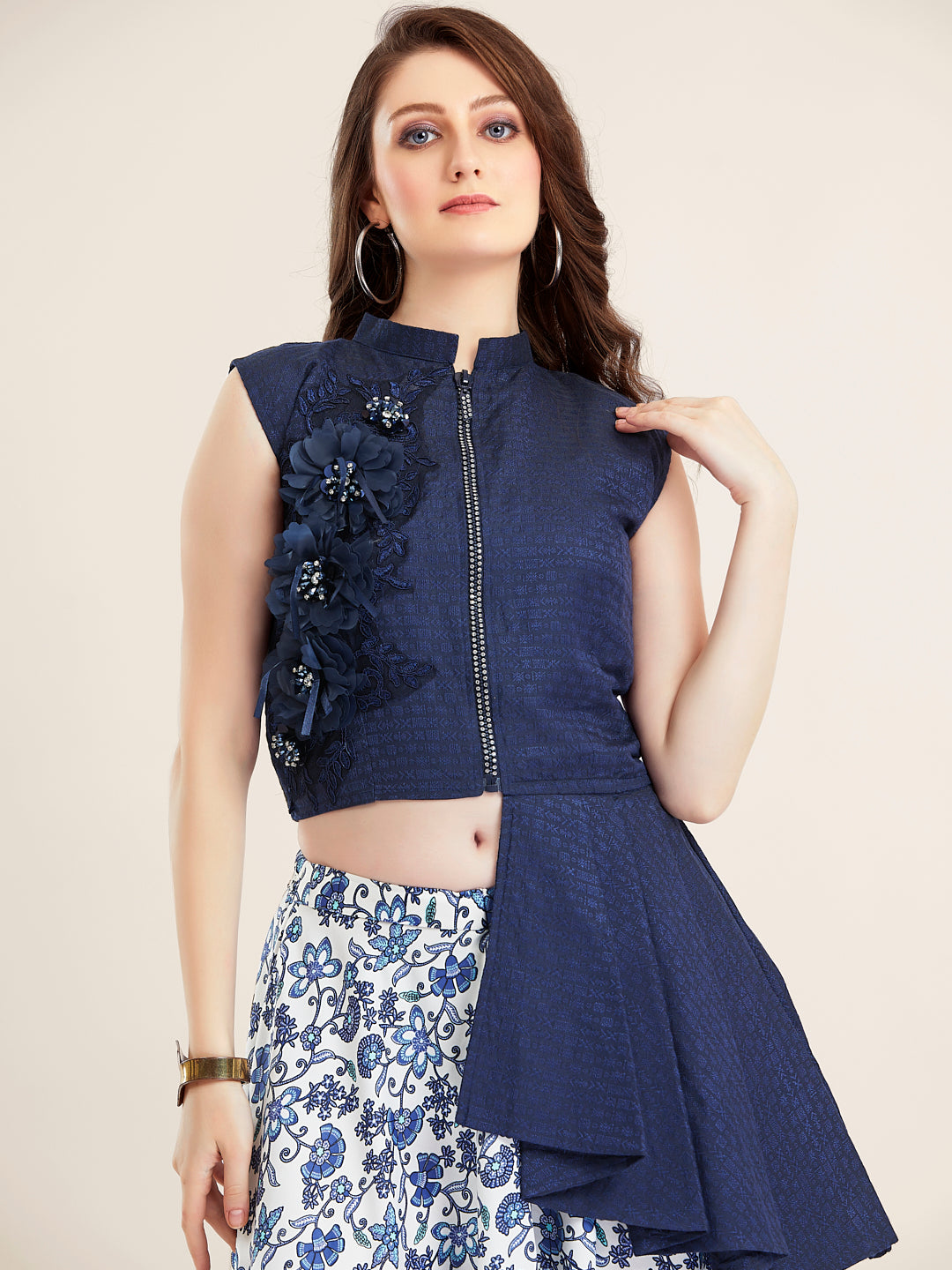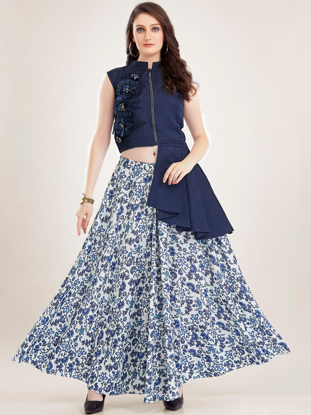 Elegance meets modern comfort in this navy blue two-piece Lehenga. The Chanderi blouse exudes regal charm, complemented by a hand-embroidered flower patch. The Lycra skirt's graceful flare adds movement, making it perfect for weddings and formal events. Complete the look with statement jewelry for a captivating and sophisticated ensemble.