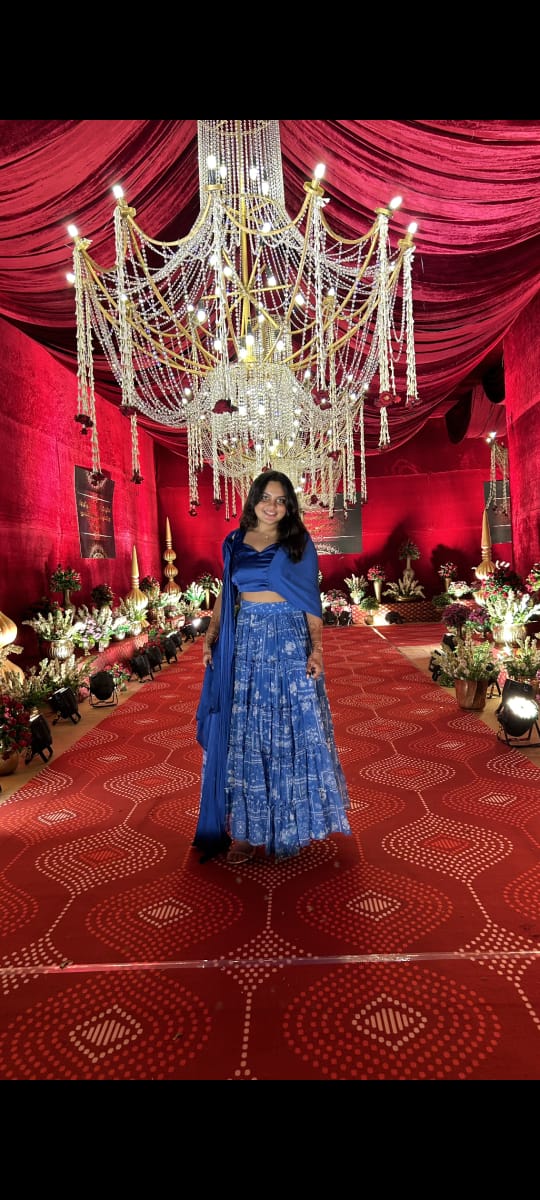 Elegant royal blue lehenga: Satin blouse offers a subtle sheen, while chiffon skirt drapes gracefully with a floral abstract print, exuding sophistication. Perfect for special occasions, radiating timeless charm.