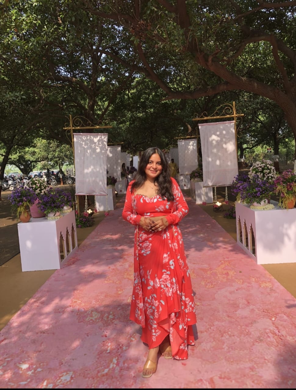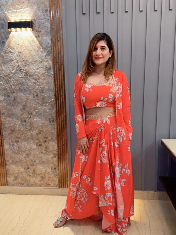Introducing our exquisite 3-piece peach co-ord set, a captivating choice for your festive wardrobe. Crafted from luxurious American crepe, this ensemble boasts a sleeveless top, a flowing drape bottom, and a knee-length, full-sleeved jacket. Adorned with a charming floral print and delicate golden lace accents on the neckline and waistline, it's an ideal choice for weddings, parties, and special events. Elevate your style and make a statement with this alluring co-ord set, perfect for any celebratory occasion.