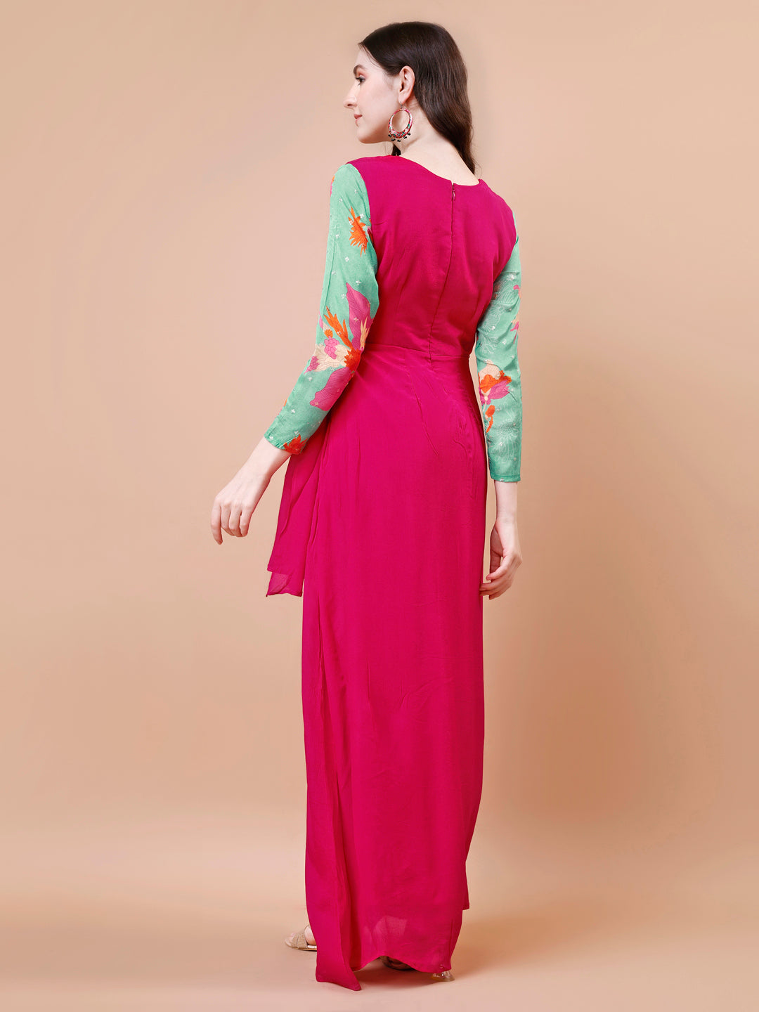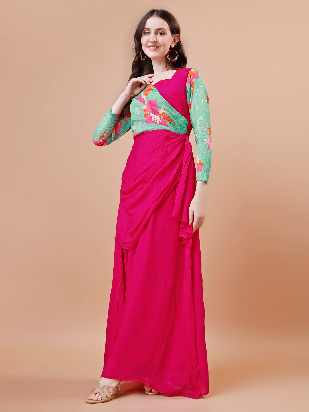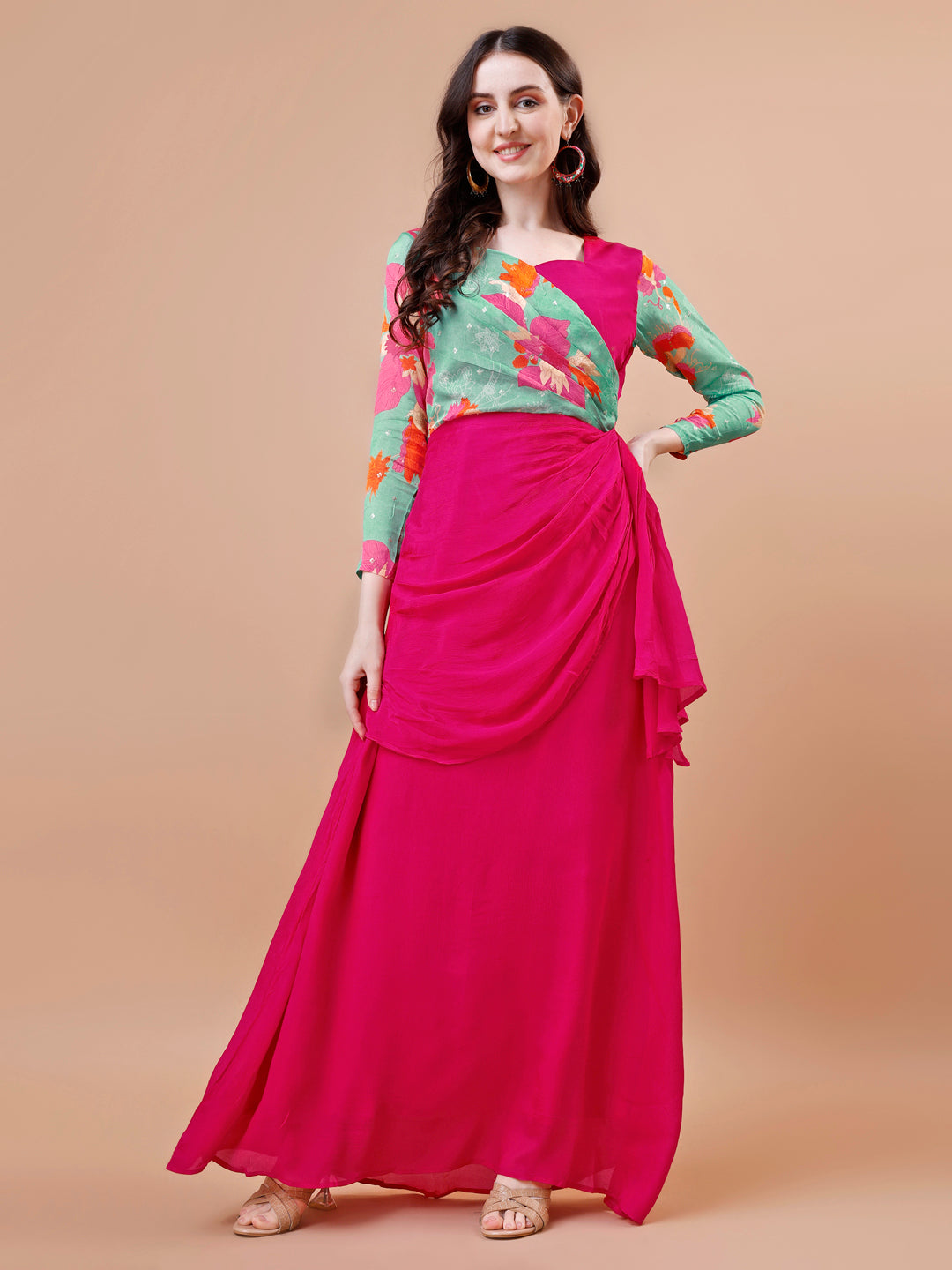 Introducing our exquisite one-piece pink draped gown. Crafted from luxurious Viscose Chinon Chiffon, this gown exudes elegance and grace. The vibrant green sleeves and top feature a delicate floral print, adding a touch of sophistication to this enchanting ensemble. Embrace the allure of this unique gown, perfect for any special occasion.