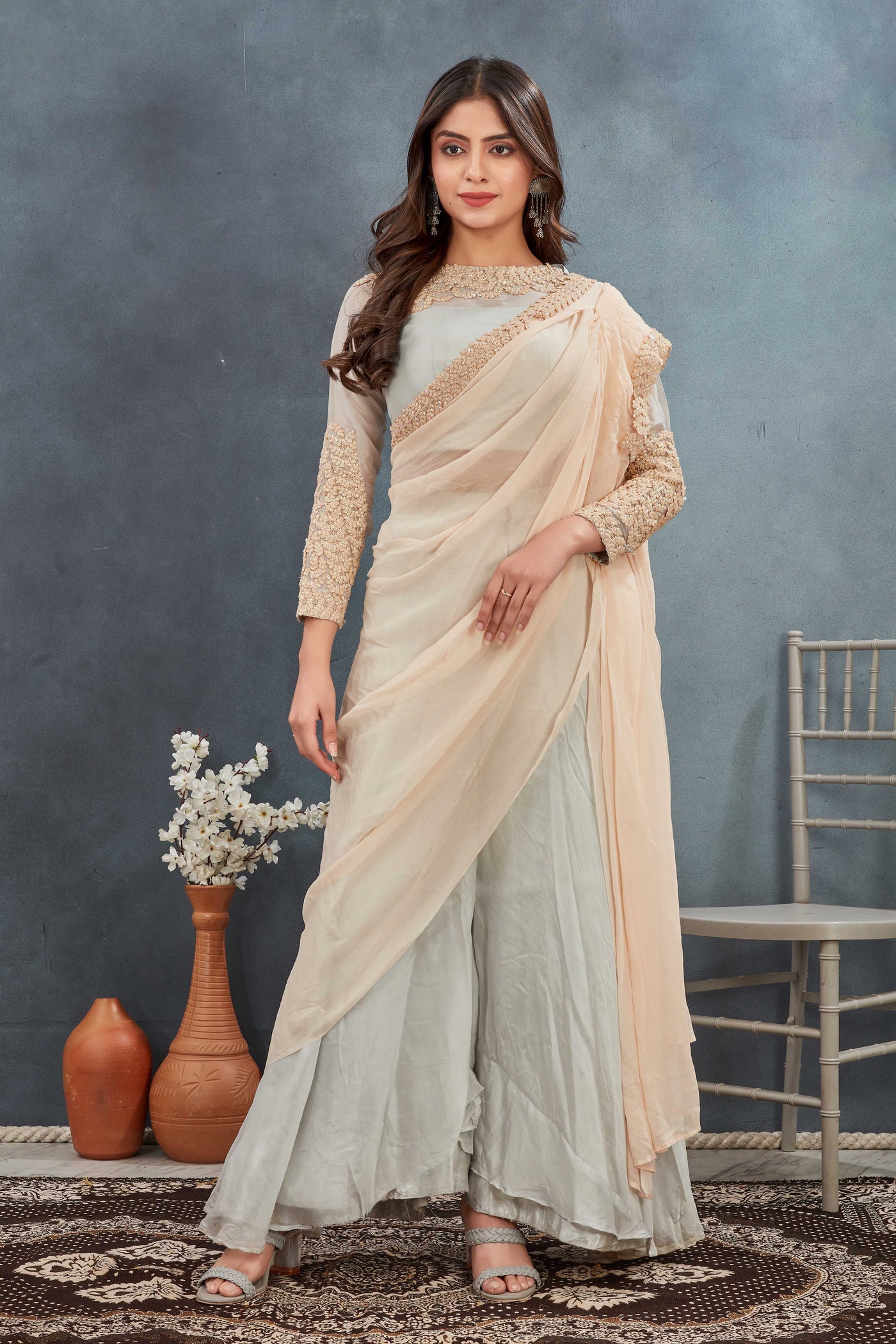 The intricately embroidered bodice, featuring delicate bead and sequin work along the neckline and sleeves, adds a luxurious touch. The wide-legged design ensures a flattering flow and all-day comfort, making it perfect for festive celebrations, cocktail evenings, and special occasions. This outfit blends the grace of a saree with the ease of a jumpsuit, ideal for the modern woman who loves making a refined statement.